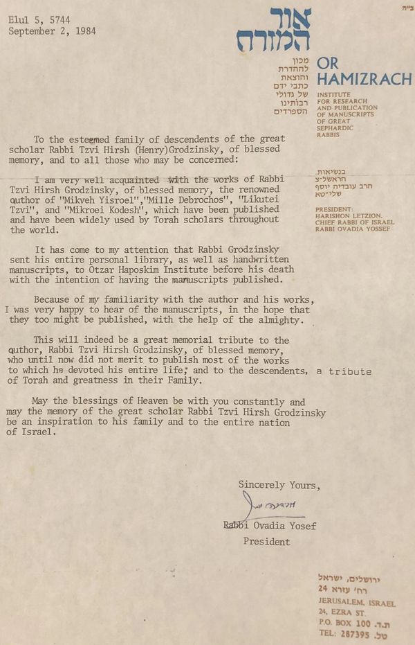 HaGaon HaRav Ovadia Yosef zt"l (1920-2013) was an Iraqi-born Talmudic scholar, a posek, and the Sephardi Chief Rabbi of Israel from 1973-1983. In this letter, Rav Yosef mentions his familiarity with Rav Grodzinsky's works, and expresses his strong support for the effort to publish his manuscripts.